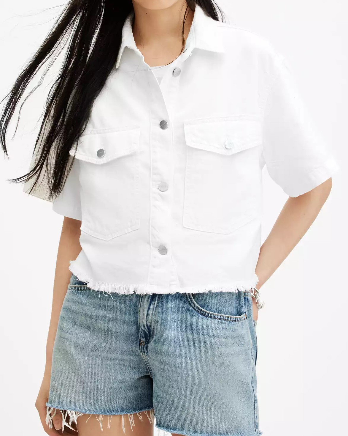 這款牛仔短板衬衫採用柔軟牛仔面料,輕便舒適,短板設計凸顯腰線,展現簡約俐落的時尚感,適合搭配高腰褲或裙子,打造多種穿搭風格。