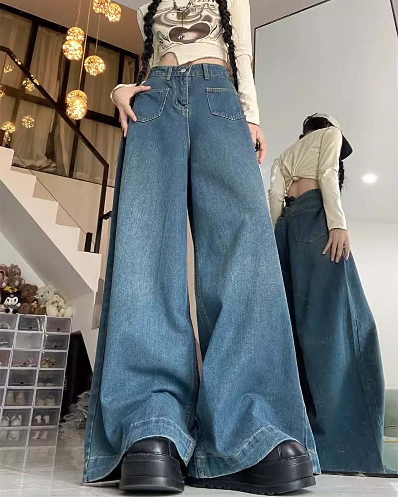 美式復古高腰大寬牛仔褲
